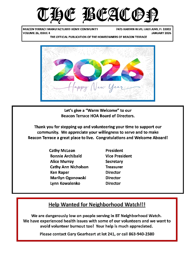 The Beacon is the official publication of the Beacon Terrace Homeowner’s Association